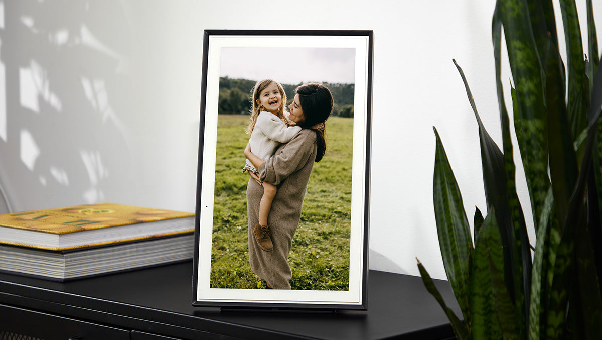Der Skylight Frame verfügt über einen wunderschönen 15" Farb-Touchscreen, der Ihre Fotos mit erstaunlicher Klarheit, Farbe und Brillanz anzeigt. Fotos werden automatisch gedreht, um sich an die Ausrichtung des Rahmens (vertikal oder horizontal) anzupassen. Außerdem hat er die perfekte Größe für einen Schreibtisch, eine Kaminsims, einen Couchtisch oder für die Küche.